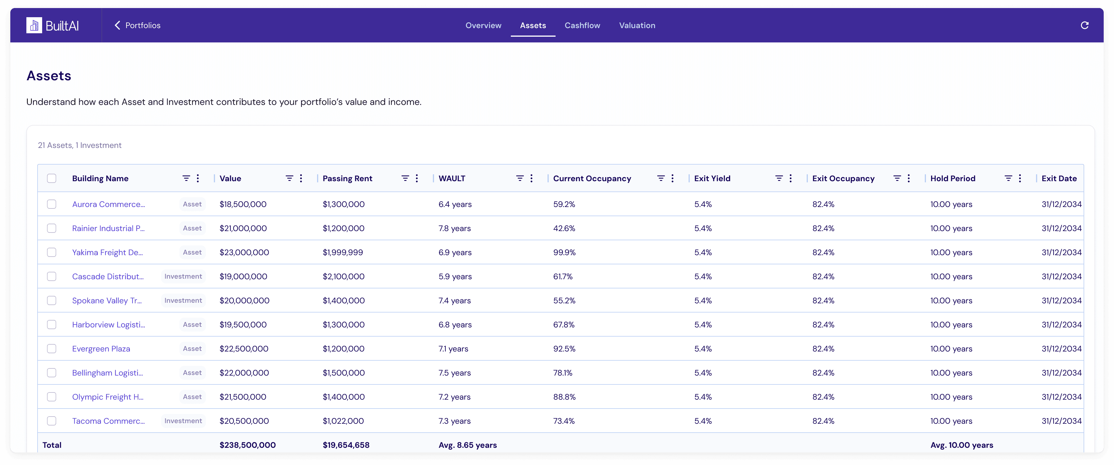 Identify concentration risk by geography, tenant, asset class or % of portfolio and identify which assets drive performance.